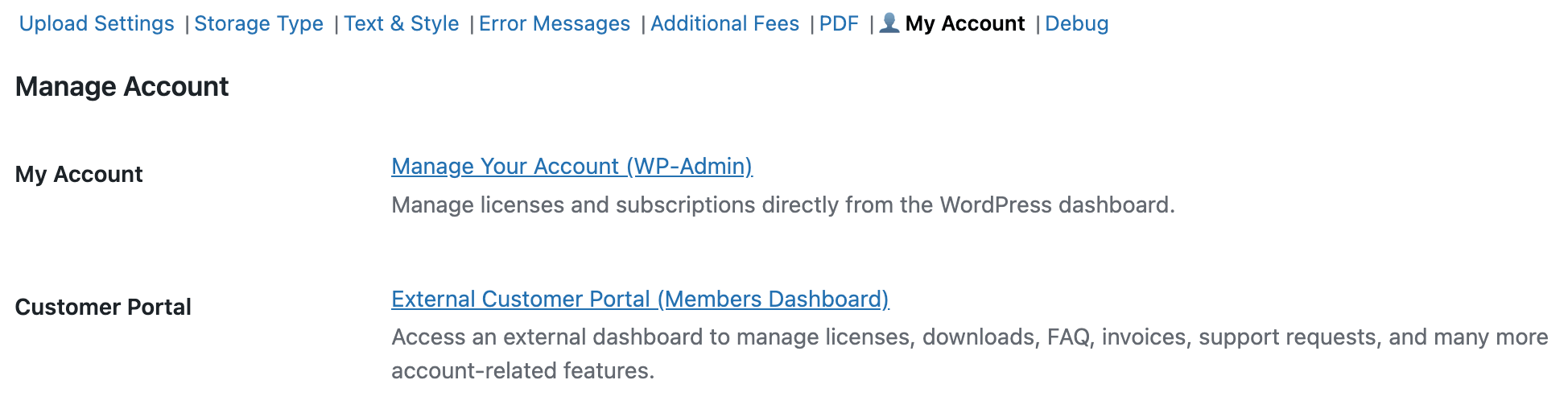 The My Account settings can be found in your WordPress dashboard under "WooCommerce → Settings → File Uploads → My Account".